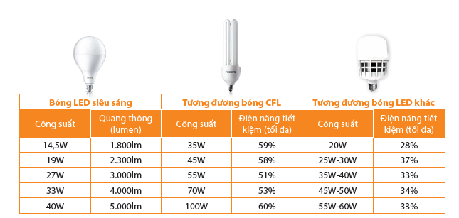 Philips đã thử nghiệm và đưa ra so sánh với bóng CFLi và bóng đèn LED công suất cao của các nhãn hàng khác. Như chúng ta đã biết, độ sáng được đo bằng đơn vi lumen (lm), với cùng 1 độ sáng bóng siêu sáng của Philips tiêu thụ điện năng ít hơn (công suất- W thấp hơn) nghĩa là bạn đã tiết kiệm nhiều hơn với bóng đèn LED Philips