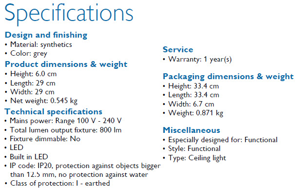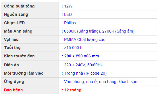 Thông số kỹ thuật bộ đèn ốp trần Led 12W Philips 31814
