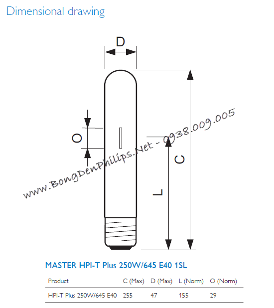 Thông số kỹ thuật của bóng đèn cao áp Philips HPI-T 250W/645 dạng thẳng E40