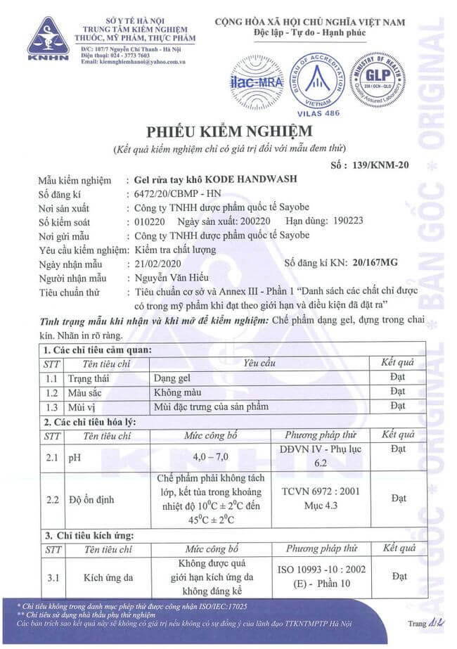 PHIẾU KIỂM NGHIỆM VÀ GIẤY CÔNG BỐ SẢN PHẨM CHỨNG NHẬN TỪ SỞ Y TẾ