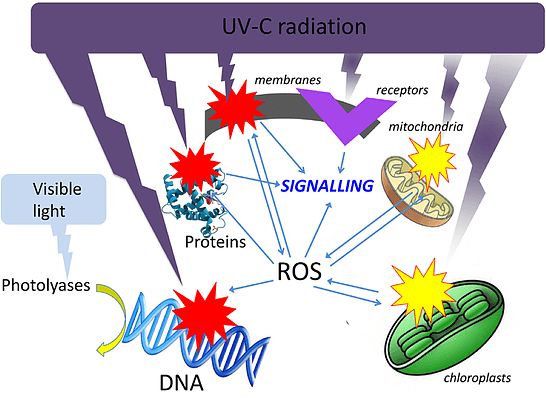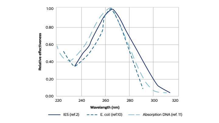 UV-C được tìm thấy trong phạm vi 100-280nm. Trong biểu đồ có thể thấy rằng hành động diệt khuẩn được tối đa hóa ở 265nm với sự giảm ở hai bên. Bóng đèn UV-C áp suất thấp của Philips TUV có mức phát xạ chính ở bước sóng 254nm trong đó tác động lên DNA là 85% giá trị cực đại và 80% trên đường cong IES. Do đó, đèn diệt khuẩn của chúng tôi cực kỳ hiệu quả trong việc phá vỡ DNA của vi sinh vật. Điều này có nghĩa là chúng không thể sao chép và gây bệnh 3 .