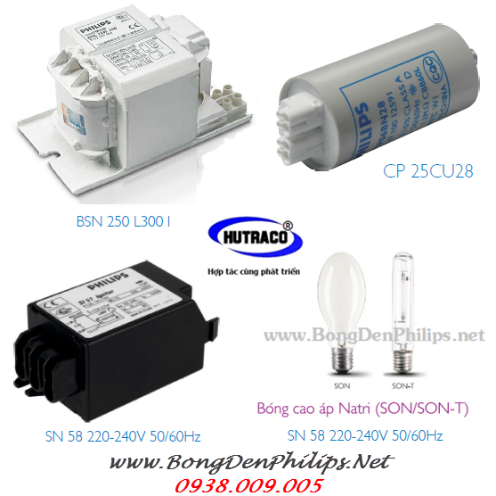 Bộ đèn cao áp Philips SODIUM 250W bao gồm chóa đèn, bóng đèn cao áp SON 250W, Ballast (tăng phô/chấn lưu) BSN 250W L300 kích SN58 và tụ 25CP CU28 tạo ra bộ đèn cao áp hoàn chỉnh.