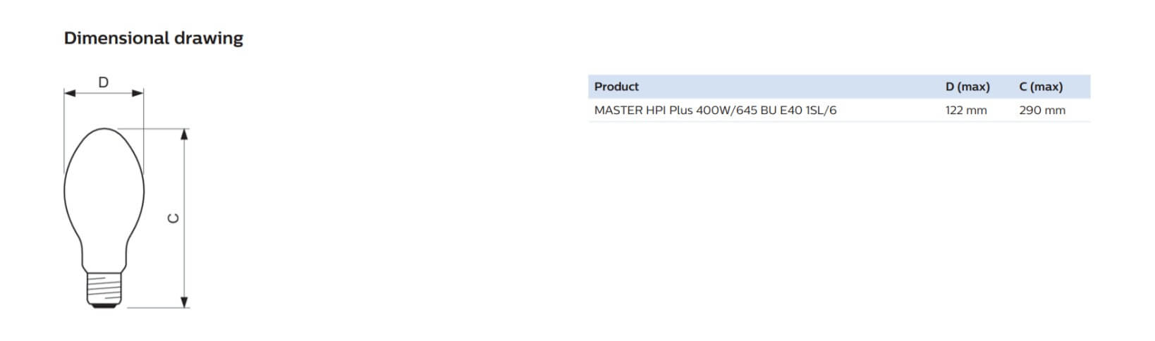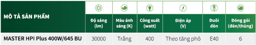 Thông số kỹ thuật của bóng đèn cao áp Philips MASTER HPI Plus 400W/645 BU E40 1SL/6 dạng bầu