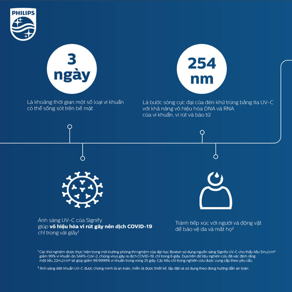 3)Dữ liệu được xác thực bởi Phòng Thí Nghiệm Các Bệnh Truyền Nhiễm Mới Quốc Gia (NEIDL) tại Đại học Boston, Hoa Kì dựa trên thí nghiệm do Tiến sĩ Anthony Griffiths (Phó Giáo sư Vi sinh tại Đại học Y khoa Boston) và nhóm của ông thực hiện tại các cơ sở của NEIDL (dữ liệu này sẽ là chủ đề của một ấn phẩm khoa học sắp tới của Đại học Boston), cho thấy các nguồn sáng UV-C của Signify chiếu xạ bề mặt vật liệu được cấy truyền SARS-CoV-2 (virus gây bệnh COVID-19) với liều UV-C là 5mJ/cm2 (thời gian tiếp xúc là 6 giây) giúp giảm 99% virus SARS-CoV-2 có trên bề mặt đó. Theo nghiên cứu này, liều UV-C 22mJ/cm2 giúp giảm đến 99,9999% virus SARS-CoV-2 trên bề mặt (thời gian tiếp xúc là 25 giây). Sử dụng liều lượng tùy theo yêu cầu nghiên cứu
