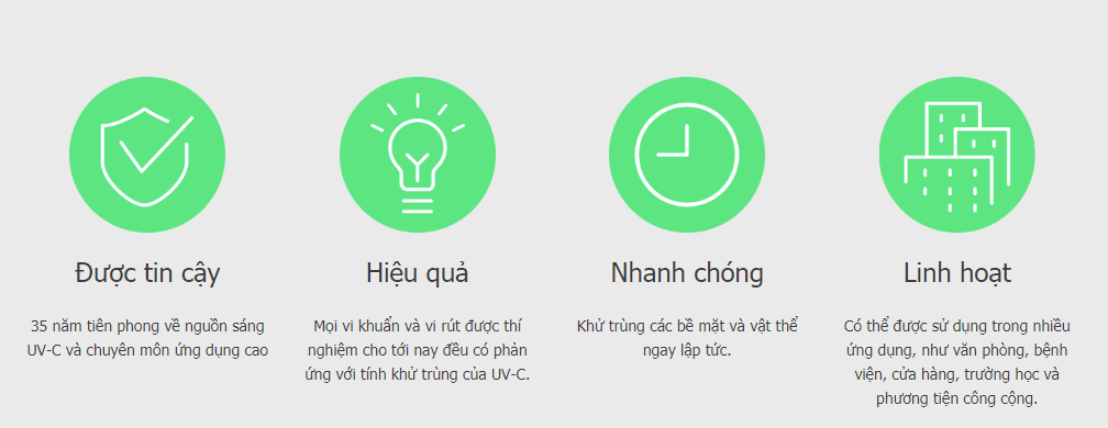 Bức xạ UV-C là một chất khử trùng đã biết cho không khí, nước và các bề mặt có thể giúp giảm thiểu nguy cơ nhiễm trùng và đã được sử dụng rộng rãi trong hơn 40 năm 1 . Tất cả các vi khuẩn và vi rút đã được thử nghiệm cho đến nay (hàng trăm năm qua, bao gồm các loại coronavirus khác nhau) đều đáp ứng với khử trùng bằng tia UV-C 2 .