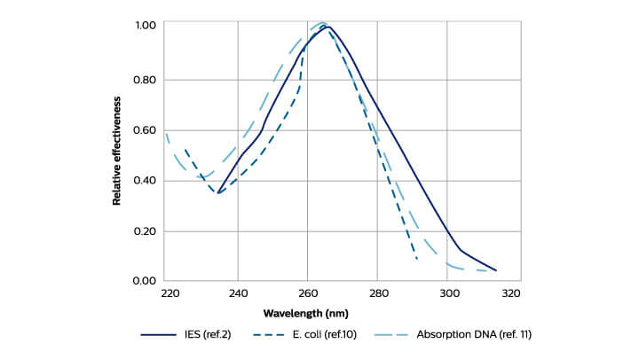 Trong biểu đồ có thể thấy rằng hoạt động diệt khuẩn đạt cực đại ở bước sóng 265 nm với mức giảm ở hai bên. Đèn UV-C Philips áp suất thấp có phát xạ chính ở bước sóng 254 nm trong đó hoạt động trên DNA là 85% giá trị đỉnh và 80% trên đường cong IES. Do đó, đèn diệt khuẩn của chúng tôi cực kỳ hiệu quả trong việc phá vỡ DNA của các vi sinh vật. Điều này có nghĩa là chúng không thể tái tạo và gây bệnh 4.