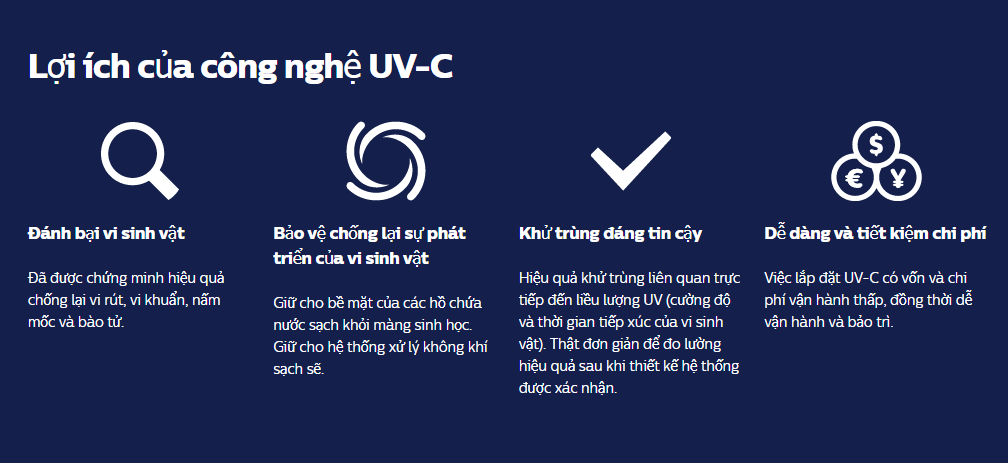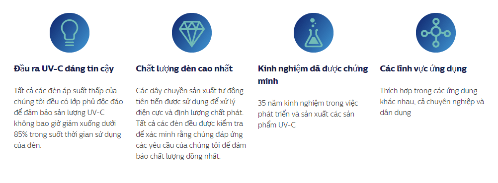 Philips cung cấp đầy đủ các loại đèn và trình điều khiển UV phù hợp để sử dụng trong các ứng dụng khác nhau trong xử lý nước và không khí dân dụng, lọc nước đô thị và công nghiệp, lọc không khí thương mại và chuyên nghiệp.
