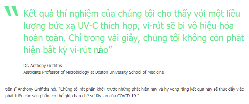 Kể từ khi bắt đầu đại dịch SARS CoV-2, Tiến sĩ Anthony Griffiths, Giáo sư chuyên về Vi Sinh tại Đại học Y Boston và nhóm cộng sự của ông đã nghiên cứu phát triển các công cụ để hỗ trợ tiến bộ khoa học trong lĩnh vực này2. Trong quá trình nghiên cứu, họ xử lý một vật liệu đã được phơi nhiễm vi rút SARS-CoV-2 bằng các liều lượng bức xạ UV-C khác nhau từ nguồn ánh sáng đèn của tập đoàn Signify và đánh giá khả năng vô hiệu hóa trong các điều kiện khác nhau. Nhóm nghiên cứu đã áp dụng liều 5mJ/cm2, và kết quả cho thấy đã giảm đến 99% vi-rút SARS-CoV-2 trong 6 giây. Cũng theo dữ liệu nghiên cứu, với liều bức xạ 22mJ/cm2, lượng vi-rút đã giảm đến 99.9999% vi-rút chỉ trong vòng 25 giây3.