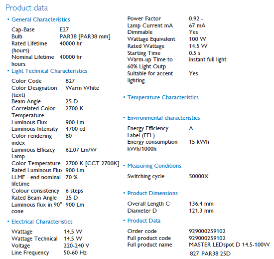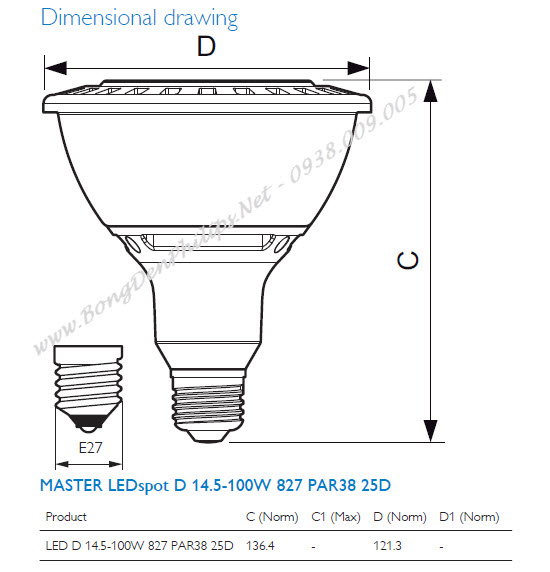 Thông số kỹ thuật bóng đèn MASTER LEDspot Philips D 14.5-100W 827 PAR38 25D