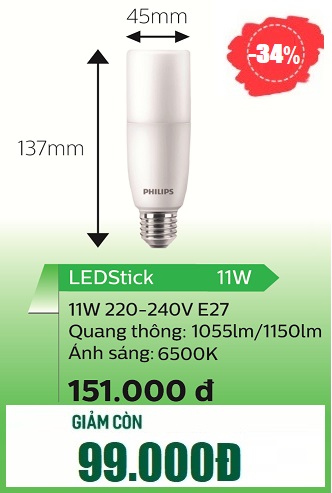 Bóng đèn Philips LED Stick 11W E27 6500K 1150Lm tiết kiệm điện vượt trội