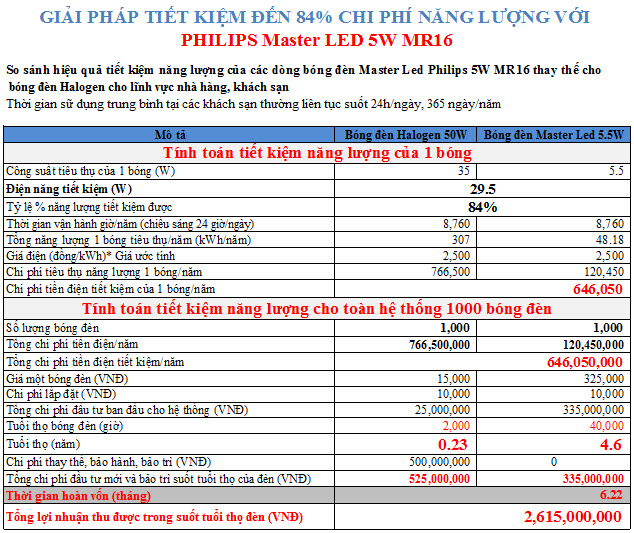 Bóng đèn Master LED 5.5W MR16 của Philips với công nghệ chiếu sáng LED giúp giảm đến 84% điện năng tiêu thụ so với bóng đèn Halogen 35W truyền thống.