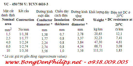 Thông số kỹ thuật dây cáp điện đơn dân dụng Cadivi CV 1.5