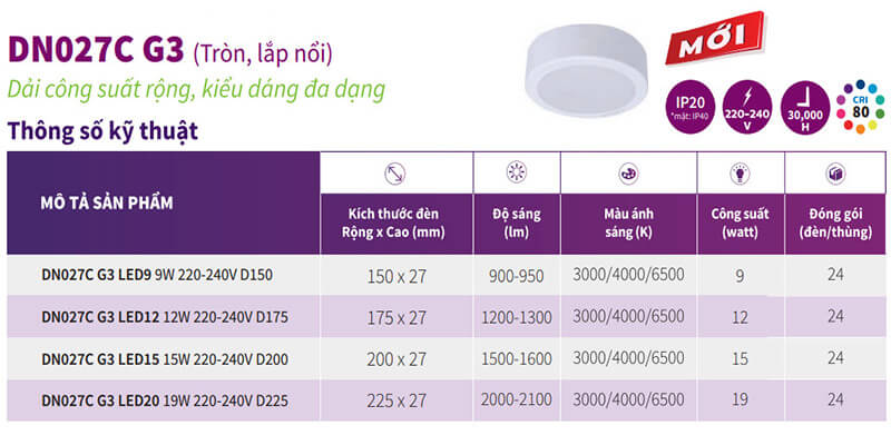 Catalogue đèn LED ốp trần lắp nổi Philips DN07C G3