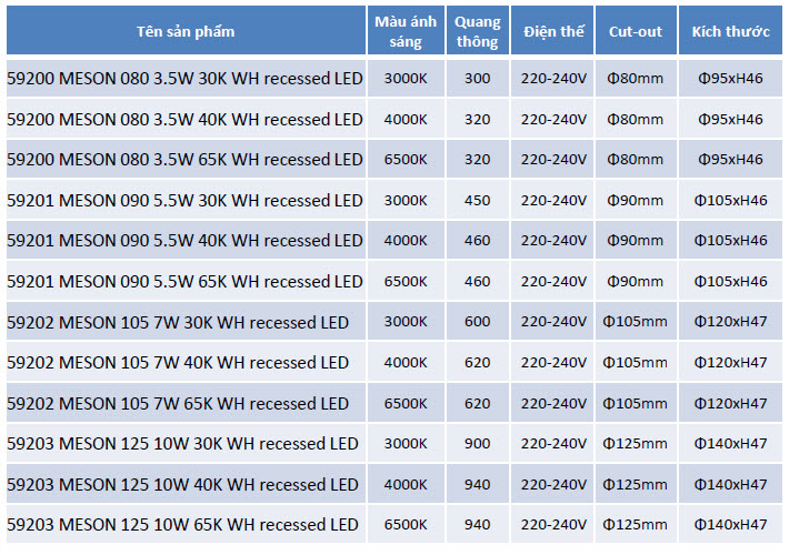 Thông số kỹ thuật đèn downlight âm trần LED Philips MESON 59203 Ø125 10W