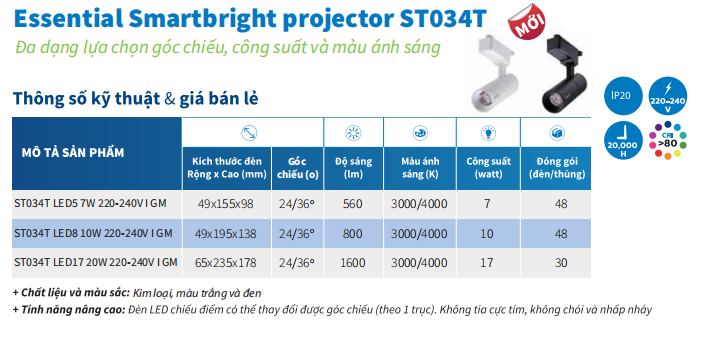 Đèn chiếu sáng dựa trên đường đi này hỗ trợ các nhà bán lẻ làm nổi bật sản phẩm của họ hoặc làm nổi bật các đối tượng nhất định. Thiết kế hiện đại và gọn gàng với trình điều khiển tích hợp và lựa chọn góc chùm 24 hoặc 36 độ khiến Máy chiếu Essential SmartBright phù hợp với nhiều ứng dụng. Việc lựa chọn 2 màu Trắng và Đen giúp Nhà bán lẻ lựa chọn sản phẩm phù hợp nhất để hòa mình vào Môi trường cửa hàng.