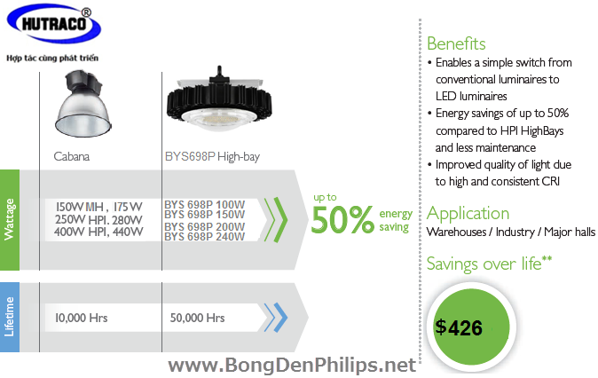 Thiết kế Led của Philips mang lại hiệu quả tiết kiệm đến 50% điện năng tiêu thụ so với đèn Highbay cao áp Metal 150W thông thường với độ sáng cao hơn hẳn, và tuổi thọ bền lâu 50,000 giờ sử dụng (tương đương 10 năm) vì thế đây là một giải pháp đầu tư kinh tế mang lại lợi ích lâu dài cho hoạt động chiếu sáng tiết kiệm năng lượng của doanh nghiệp.